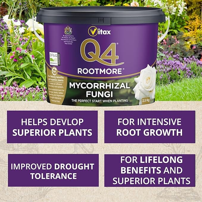 The Vitax Q4 Rootmore is an organic blend designed to stimulate robust root growth and enhance plant resilience. This unique formula is Enriched with mycorrhizal fungi, seaweed, humates, and beneficial bacteria. This multipurpose formula is ideal for roses, shrubs, trees, and edible plants, providing an organic solution for stronger roots. As a product focused on root health and soil biology, it is categorized under Specialist Plant Food or Soil Supplements. Its main benefit is Intensive Root Growth, as it Boosts root development for a healthier start. It Improves Nutrition by Enhanc[ing] vitamin and nutrient uptake for vibrant growth. It offers Disease Resistance, Strengthen[ing] plants against diseases and environmental stress. Its Versatile Application makes it Suitable for a wide variety of plants, including edibles. Crucially, it is Certified Organic, being Approved by OF&G for eco-friendly gardening.