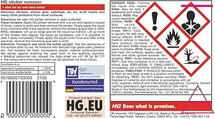 💪 HG Sticker Remover makes removing stubborn sticker residues and adhesives a breeze! Designed for various surfaces, it effectively tackles sticky labels, glue marks, tape residue, and more, without causing damage.