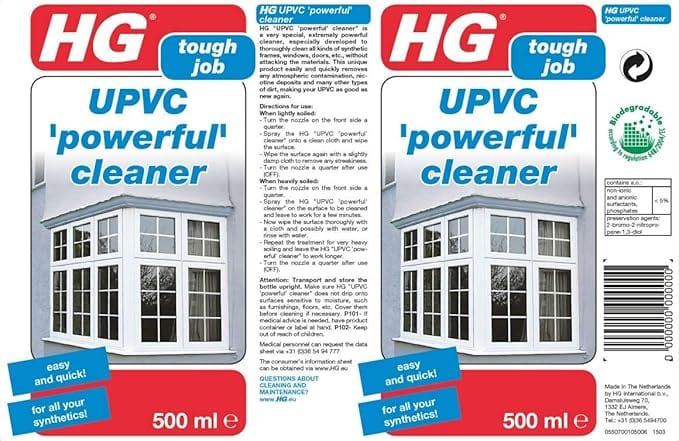 HG UPVC Cleaner is a powerful, easy-to-use formula designed to clean and restore UPVC surfaces, making them look like new.