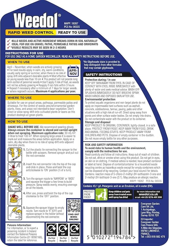 The Weedol Path & Gravel Weed Control Ready to Use is a three liter, pre mixed weedkiller spray designed for fast and efficient weed elimination on gravel paths, permeable patios, and driveways. This easy to use solution is free from glyphosate, making it a great choice for environmentally conscious gardeners. Its active ingredient, pelargonic acid, starts working immediately, providing visible results in as little as three hours. The formula naturally breaks down in the soil, ensuring the area is ready for replanting in just three days. The ready to use format with a manual sprayer is highly convenient for quick spot treatment. The bottle is made from one hundred percent recycled plastic and is fully recyclable along with the trigger. This product is categorized under Path & Patio Weed Control or Glyphosate Free.